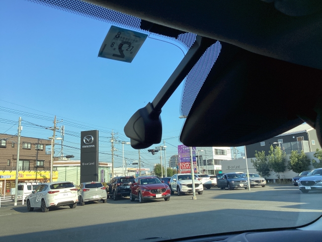 フロント側ドライブレコーダー。運転中の映像・音声などを記録して、交通事故やトラブルが起きた時の正確な状況把握に役立つドライブレコーダーが装着されています。