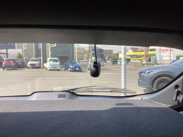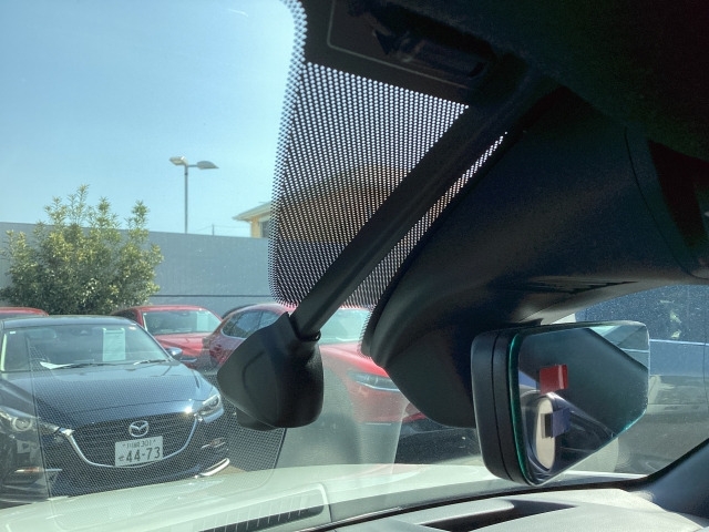 フロント側ドライブレコーダー。運転中の映像・音声などを記録して、交通事故やトラブルが起きた時の正確な状況把握に役立つドライブレコーダーが装着されています。