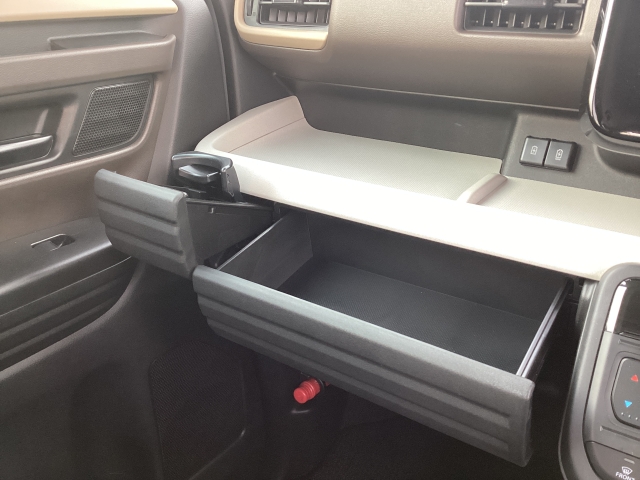 助手席前にはインパネトレイと引き出し式のボックスにも収納が可能。ドリンクホルダーも備えています♪