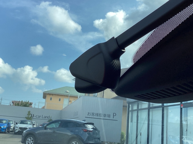 フロント側ドライブレコーダー。運転中の映像・音声などを記録して、交通事故やトラブルが起きた時の正確な状況把握に役立つドライブレコーダーが装着されています。