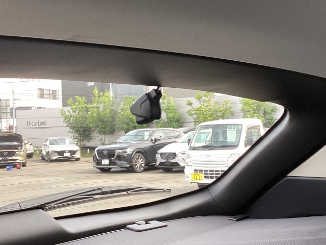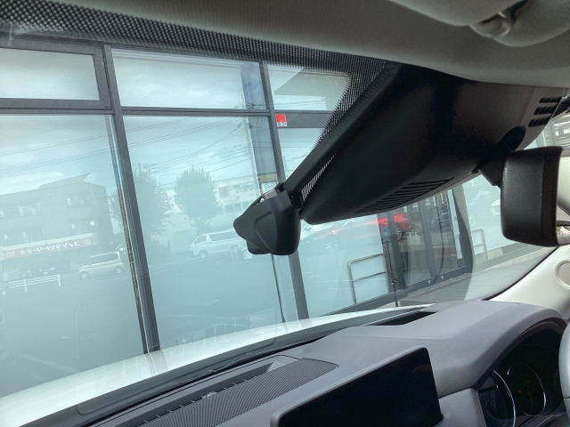 フロント側ドライブレコーダー。運転中の映像・音声などを記録して、交通事故やトラブルが起きた時の正確な状況把握に役立つドライブレコーダーが装着されています。