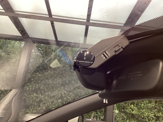 フロント側ドライブレコーダー。運転中の映像・音声などを記録して、交通事故やトラブルが起きた時の正確な状況把握に役立つドライブレコーダーが装着されています。