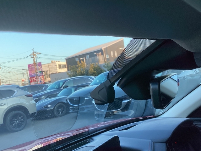 フロント側ドライブレコーダー。運転中の映像・音声などを記録して、交通事故やトラブルが起きた時の正確な状況把握に役立つドライブレコーダーが装着されています。
