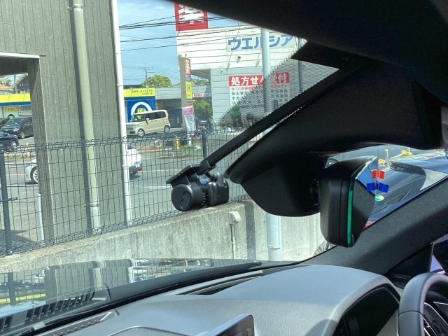 フロント側ドライブレコーダー。運転中の映像・音声などを記録して、交通事故やトラブルが起きた時の正確な状況把握に役立つドライブレコーダーが装着されています。