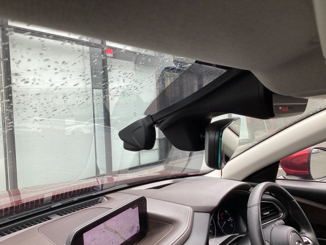 フロント側ドライブレコーダー。運転中の映像・音声などを記録して、交通事故やトラブルが起きた時の正確な状況把握に役立つドライブレコーダーが装着されています。