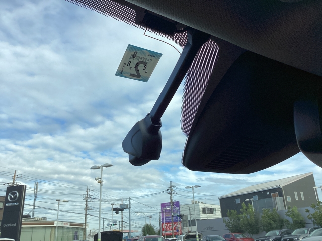 フロント側ドライブレコーダー。運転中の映像・音声などを記録して、交通事故やトラブルが起きた時の正確な状況把握に役立つドライブレコーダーが装着されています。