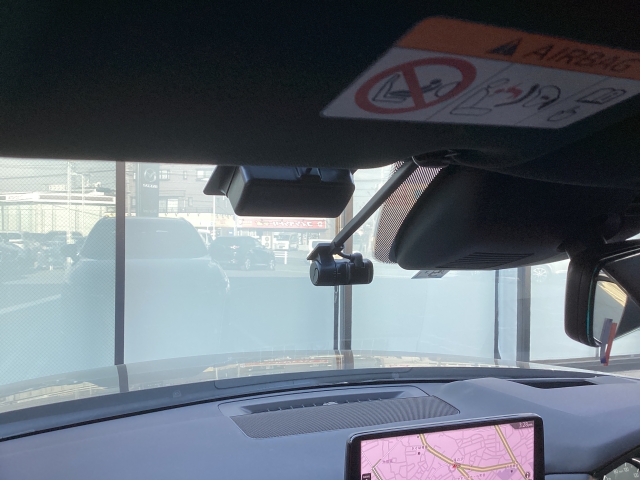 フロント側ドライブレコーダー。運転中の映像・音声などを記録して、交通事故やトラブルが起きた時の正確な状況把握に役立つドライブレコーダーが装着されています。