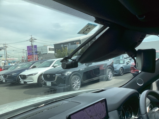 フロント側ドライブレコーダー。運転中の映像・音声などを記録して、交通事故やトラブルが起きた時の正確な状況把握に役立つドライブレコーダーが装着されています。