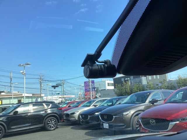 フロント側ドライブレコーダー。運転中の映像・音声などを記録して、交通事故やトラブルが起きた時の正確な状況把握に役立つドライブレコーダーが装着されています。