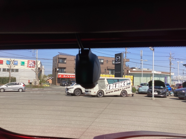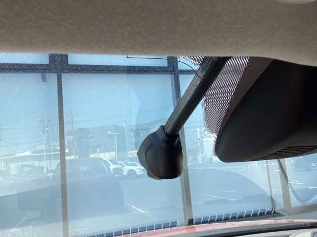 フロント側ドライブレコーダー。運転中の映像・音声などを記録して、交通事故やトラブルが起きた時の正確な状況把握に役立つドライブレコーダーが装着されています。