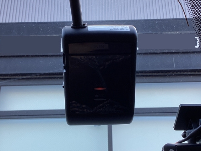 フロント側ドライブレコーダー。運転中の映像・音声などを記録して、交通事故やトラブルが起きた時の正確な状況把握に役立つドライブレコーダーが装着されています。