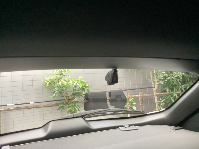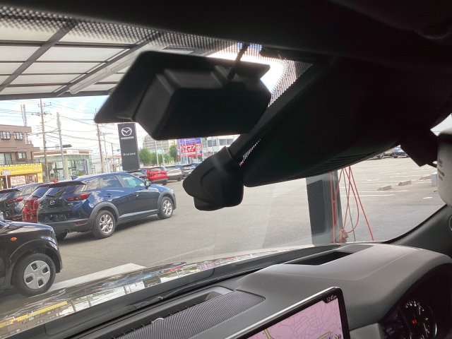 フロント側ドライブレコーダー。運転中の映像・音声などを記録して、交通事故やトラブルが起きた時の正確な状況把握に役立つドライブレコーダーが装着されています。