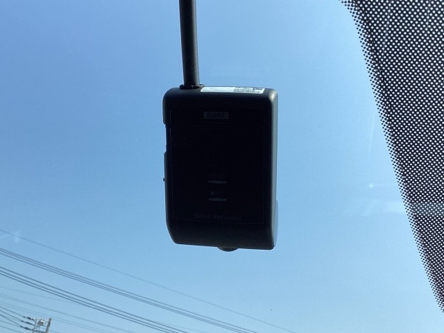 フロント側ドライブレコーダー。運転中の映像・音声などを記録して、交通事故やトラブルが起きた時の正確な状況把握に役立つドライブレコーダーが装着されています。