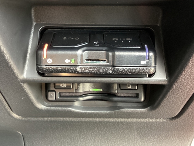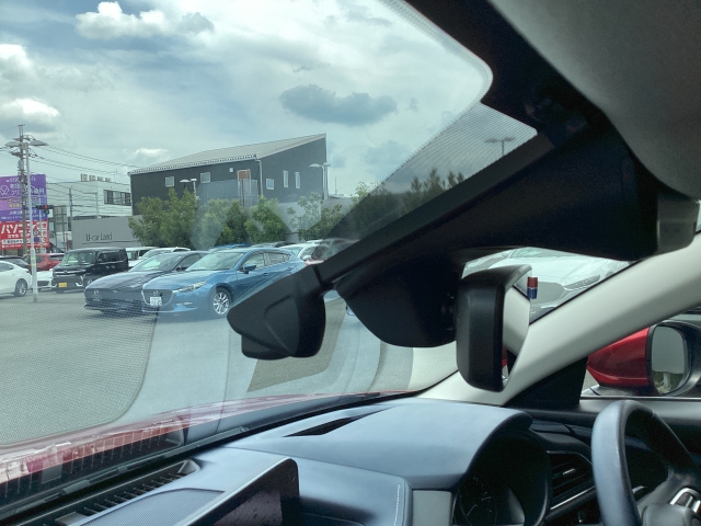 フロント側ドライブレコーダー。運転中の映像・音声などを記録して、交通事故やトラブルが起きた時の正確な状況把握に役立つドライブレコーダーが装着されています。