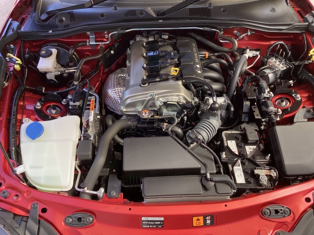 【ロードスター専用設計SKYACTIV-G1.5】FRレイアウト専用4-2-1排気をはじめ、レブリミットを7.500rpm設定しスポーツカーらしく高回転までよく回るエンジンに仕上げております