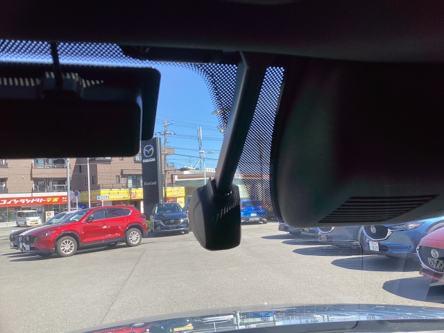 フロント側ドライブレコーダー。運転中の映像・音声などを記録して、交通事故やトラブルが起きた時の正確な状況把握に役立つドライブレコーダーが装着されています。