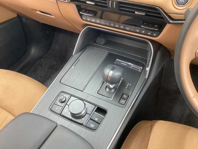 マツダコネクトモニターは12.3インチの大型モニターです。タッチパネルはできませんので、ひじ掛け近くのコマンダーで操作して頂きます。またこちらのタンカラーのダッシュボードはスエード調でより質感がございます。