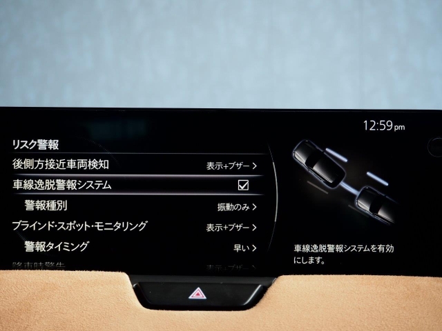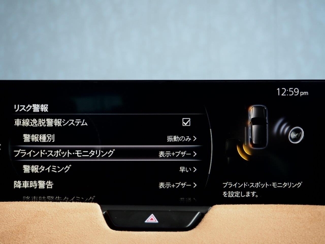 約15km/h以上で前進しているときに後方からの接近車両を検知すると、接近状態に応じてドアミラー表示を点灯。その状態で点灯した側にウィンカー操作すると、点滅表示と警報音でドライバーに危険を知らせます。