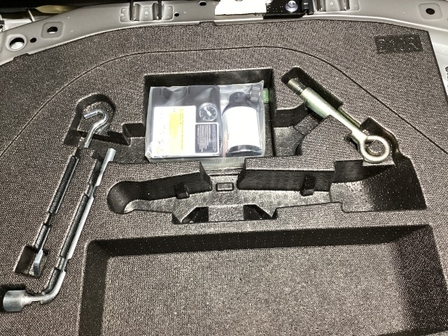 スペアタイヤの代わりに、簡易パンク修理キット搭載。釘が刺さった程度の穴でしたら補修可能です。パンクの箇所や状況によっては補修できない場合もございます。予めご了承下さい。