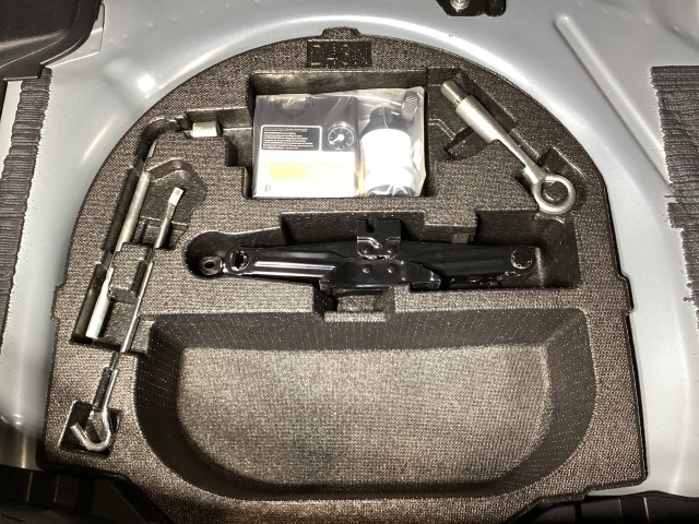 スペアタイヤの代わりに、簡易パンク修理キット搭載。釘が刺さった程度の穴でしたら補修可能です。パンクの箇所や状況によっては補修できない場合もございます。予めご了承下さい。