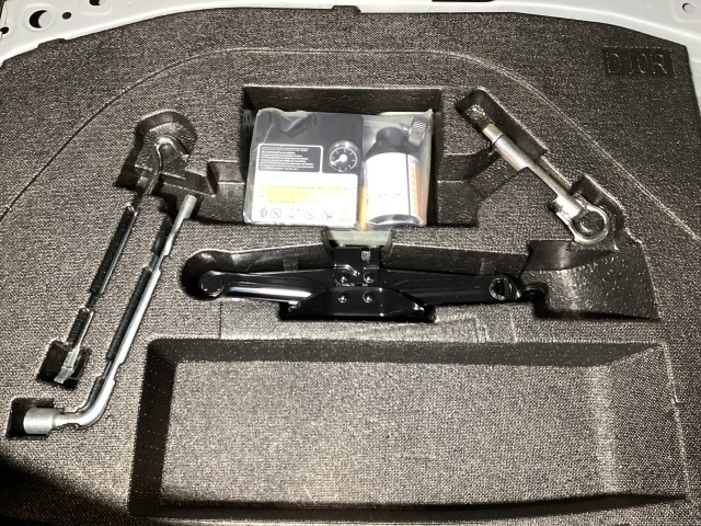 スペアタイヤの代わりに、簡易パンク修理キット搭載。釘が刺さった程度の穴でしたら補修可能です。パンクの箇所や状況によっては補修できない場合もございます。予めご了承下さい。