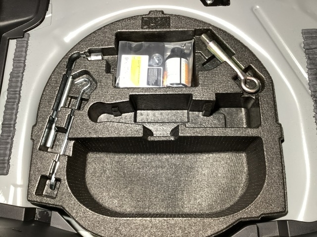 スペアタイヤの代わりに、簡易パンク修理キット搭載。釘が刺さった程度の穴でしたら補修可能です。パンクの箇所や状況によっては補修できない場合もございます。予めご了承下さい。