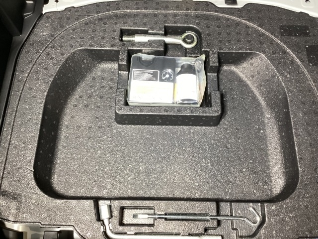 スペアタイヤの代わりに、簡易パンク修理キット搭載。釘が刺さった程度の穴でしたら補修可能です。パンクの箇所や状況によっては補修できない場合もございます。予めご了承下さい。