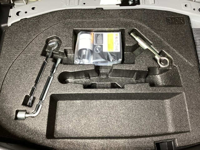 スペアタイヤの代わりに、簡易パンク修理キット搭載。釘が刺さった程度の穴でしたら補修可能です。パンクの箇所や状況によっては補修できない場合もございます。予めご了承下さい。