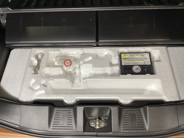 スペアタイヤの代わりに、簡易パンク修理キット搭載。釘が刺さった程度の穴でしたら補修可能です。パンクの箇所や状況によっては補修できない場合もございます。予めご了承下さい。